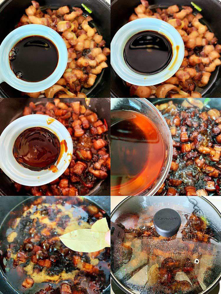 - Lúc này thêm 3 muỗng canh nước tương loại nhạt, 3 muỗng canh nước tương loại đậm đặc, dầu màu điều, xào cho đến khi thịt có màu, thêm ít rượu nấu ăn mà không cần thêm nước, đun sôi.