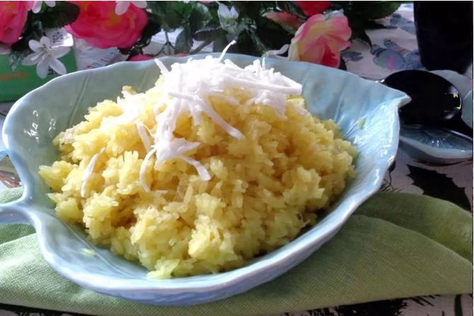 Xôi cho ra dĩa, trang trí dừa non thái sơị, bạn có thể rắc thêm vừng rang giã nhỏ hay đậu phộng rang nếu thích.