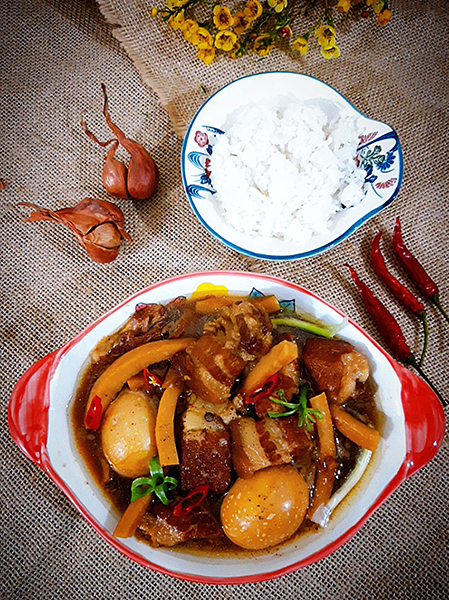 Món thịt kho trứng, dừa ăn với bát cơm nóng là ngon nhất.
