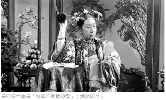 Điều kỳ quặc thứ tư là “không được rụng tóc lên gối”: Điều này thì có rất ít người biết đến, trong lúc chải tóc rất khó tránh làm tóc rụng, nhưng Từ Hi thái hậu rất chăm sóc mái tóc của mình, hơn nữa còn cho rằng tóc có quan hệ mật thiết với việc sống lâu, nếu rụng tóc nghĩa là bị tổn thọ. Từng có một thái giám chải đầu cho Từ Hi, kết quả không cẩn thận làm rụng một sợi tóc, Từ Hi nổi giận yêu cầu thái giám đó phải nối lại sợi tóc đó, khiến cho tên thám giám sợ đến mức quỳ xuống khóc lóc, khi ấy Từ Hi mới chịu đuổi tên thái giám ra ngoài.