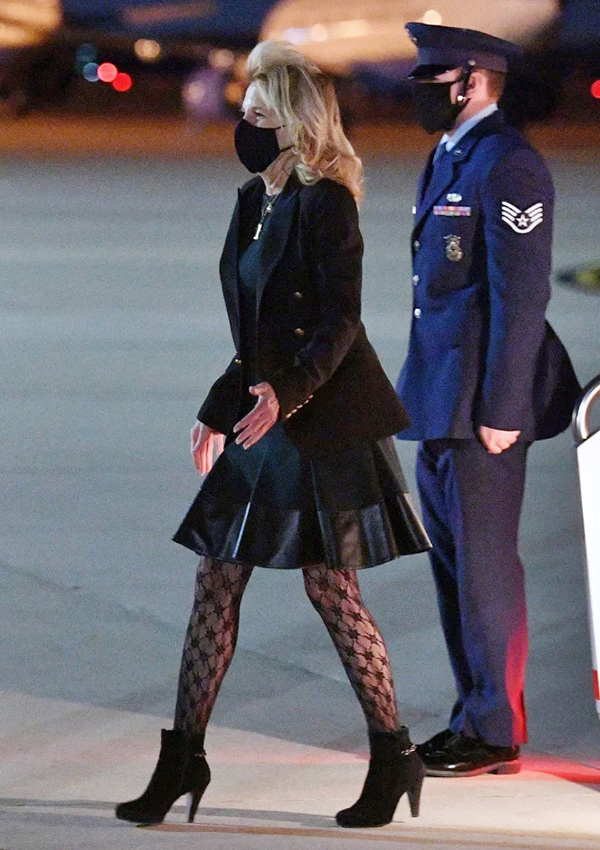 Trước đó, bà Jill Biden trở thành tâm điểm tranh cãi trên mạng xã hội khi xuất hiện tại Căn cứ Không quân Andrews hôm 1/4 với set đồ đen gồm váy xòe phối da, blazer, quần tất họa tiết đan chéo và boots cao gót da lộn. Nhiều người cho rằng nữ tiến sĩ 70 tuổi "quá già" để mặc tất lưới, bởi vậy trông bà "lố bịch, kém sang, không phù hợp địa vị".
