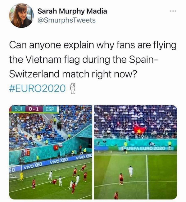 Nhiều cờ đỏ sao vàng được treo trong một trận bóng đá đấu khuôn khổ giải EURO 2020. Tại sân Peterburg (tên cũ là Leningrad) diễn ra trận Tây Ban Nha gặp Thụy Sĩ, một loạt lá cờ đỏ đã xuất hiện trên khán đài.