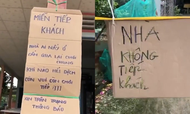 Trong video được Facebooker Trúc Huỳnh chia sẻ, một người dân ký tên Pé Lì viết: "Miễn tiếp khách. Nhà ai nấy ở, cấm qua lại chơi chung. Khi nào hết dịch, còn vui còn chơi tiếp. Xin trân trọng thông báo". Một hộ dân khác treo biển: "Đừng ai vào nhà tui", hoặc "Nhà không tiếp khách"...