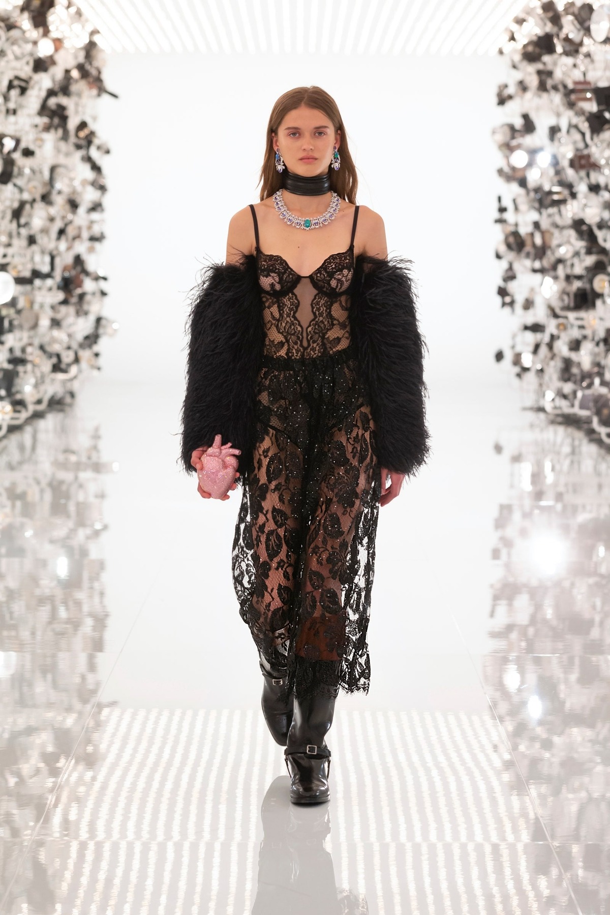 Thay vì váy dài phủ ấm chân thường được chọn trong mùa lạnh, váy ngắn được đồng loạt Versace, Valentino, Lanvin, LaQuan Smith, Tom Ford, Schiaparelli, Chanel, Dolce & Gabbana... lăng xê. Các nhà mốt gợi ý người mặc có thể sử dụng tất len, quần legging họa tiết độc đáo, bốt cao ngang đùi để tăng vẻ thời trang. Ảnh: Versace