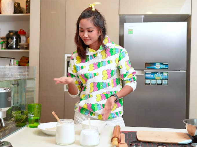 Xa nhà đã lâu, H'Hen Niê thường nấu các món ăn của người Ê Đê, bên cạnh các món ăn hot trend mùa dịch. Cô cũng thường xuyên giữ liên lạc với người thân trong gia đình đang ở buôn làng tại Đăk Lăk. Mới đây, khi thấy em gái đăng tải món bánh tiêu lên mạng xã hội, cô nàng lập tức xin công thức để làm thử. H'Hen Niê cho biết, từ đầu dịch tới giờ, cô làm món bánh gì cũng "fail" (hỏng), trong đó có sự cố tập làm bánh mì nhưng bị cứng đơ "ném là lủng đầu".