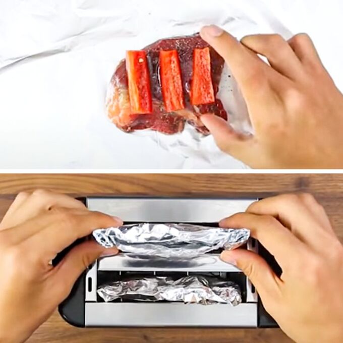 Bạn hoàn toàn có thể làm được món bít tết ngon mà không cần bếp nướng hoặc chảo. Bạn lấy một ít giấy bạc và đặt miếng bít tết lên, thêm gia vị, dầu và hạt tiêu cho vừa ăn, sau đó bọc tất cả trong giấy bạc và đặt nó vào máy nướng bánh mì trong 10 phút là món ăn đã sẵn sàng.