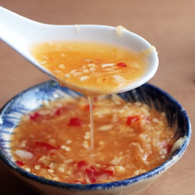 - Pha nước chấm: Cho vào chén nguyên liệu đã giã nhuyễn trước đó, cùng với 1/2 muỗng cà phê đường trắng, 4 muỗng canh nước mắm. Dùng muỗng trộn đều, giúp nguyên liệu nhanh tan. Sau đó, vắt 1 lát chanh vào chén, khuấy đều.