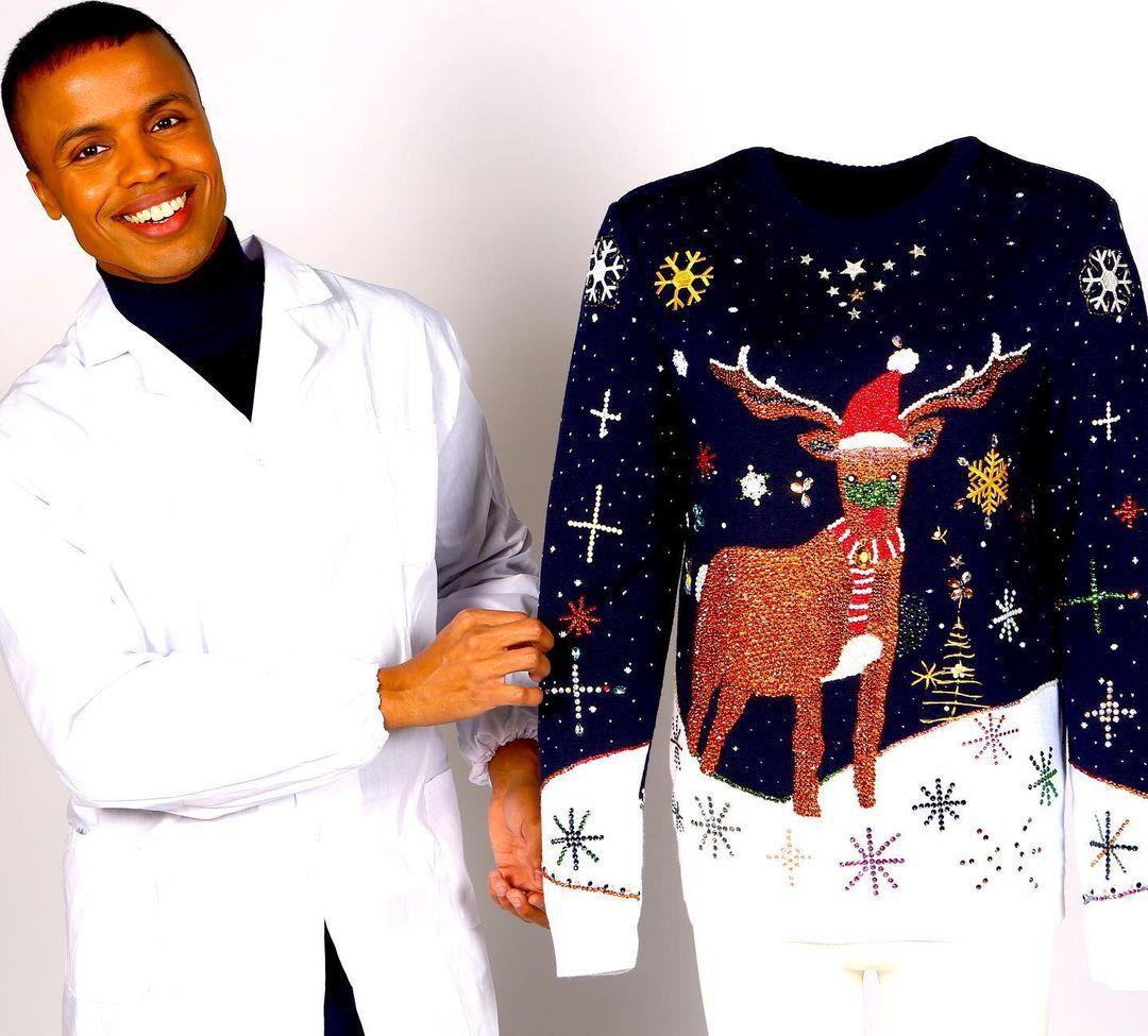 Chiếc áo len Giáng sinh được may bằng chỉ lụa vàng 24k giá 300 bảng Anh từ một cửa tiệm chuyên dụng ở Pháp, 2.000 viên pha lê Swarovski trị giá 1.000 bảng Anh và riêng lớp lót lụa Ý màu xanh navy đã tốn 200 bảng Anh. Giữa áo là hình chú tuần lộc lớn màu đỏ, điểm tô những ngôi sao nạm bạc cầu kỳ và đính kết 150 viên kim cương giá 5.000 bảng Anh. Phần thân chính làm từ len và bông cao cấp được mô tả là “mềm mại như lông chú mèo con”. Thậm chí chiếc khăn trắng đỏ trên cổ tuần lộc còn được gắn vàng và đá Swarovski.