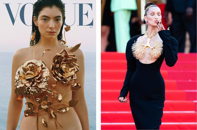 Nhắc đến các liên hoan phim và những nhân vật nổi tiếng trong năm, chắc chắn một trong những khoảnh khắc đáng nhớ nhất năm 2021 là Bella Hadid sải bước trên thảm đỏ Liên hoan phim Cannes lần thứ 74 trong chiếc váy đen khoét ngực tạo bạo thuộc bộ sưu tập thời trang cao cấp của Schiaparelli, thêm nổi bật với dây chuyền “lá phổi” mạ vàng.