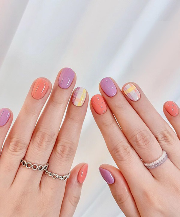 Móng tay ngắn không thể tạo được họa tiết cầu kỳ. Điều này đồng nghĩa với việc bạn nên ưu tiên các kiểu nail đơn sắc. Nail nhám màu pastel như xanh bơ, hồng, xanh thiên thanh kết hợp trên từng ngón giúp bàn tay trông sang chảnh hơn. Sơn nhũ ánh màu đồng trên một móng để tạo sự nổi bật.