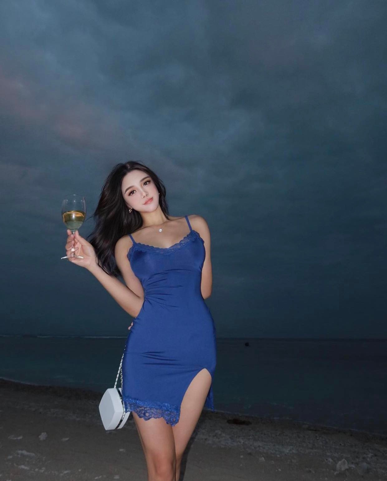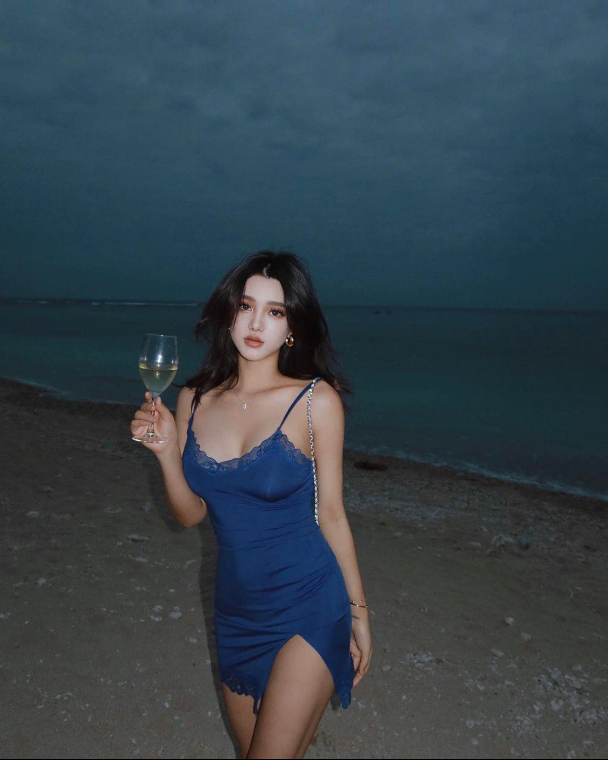 Cô nàng ghi điểm khi diện váy ngủ đẹp sang, đẹp thời thượng đi dạo biển đêm.