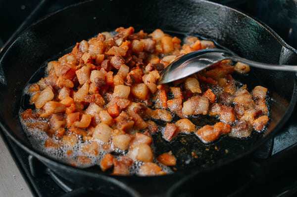 Cho mỡ vào chảo, thêm nước, thêm vài lát gừng, đun sôi lên để chần qua mỡ. Sau khi nước trong nồi sôi, hớt bỏ bọt, chần nước trong khoảng 3 phút rồi vớt mỡ ra, để ráo. Bước này sẽ giúp mỡ lợn trắng hơn mà không có mùi hôi đặc biệt.