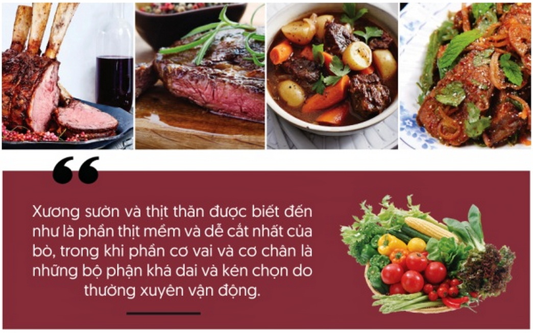 Xương sườn và thịt thăn được biết đến như là phần thịt mềm và dễ cắt nhất của bò, trong khi phần cơ vai và cơ chân là những bộ phận khá dai và kén chọn do thường xuyên vận động.