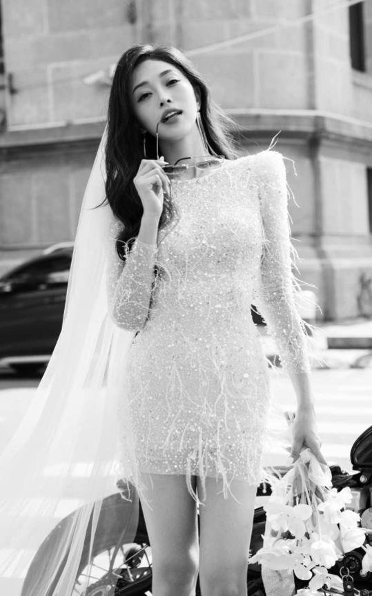 Phương Nga diện chiếc váy trắng bó sát được đính cườm và lông vũ. Độ dài vừa đủ giúp Phương Nga khoe đôi chân thon nuột