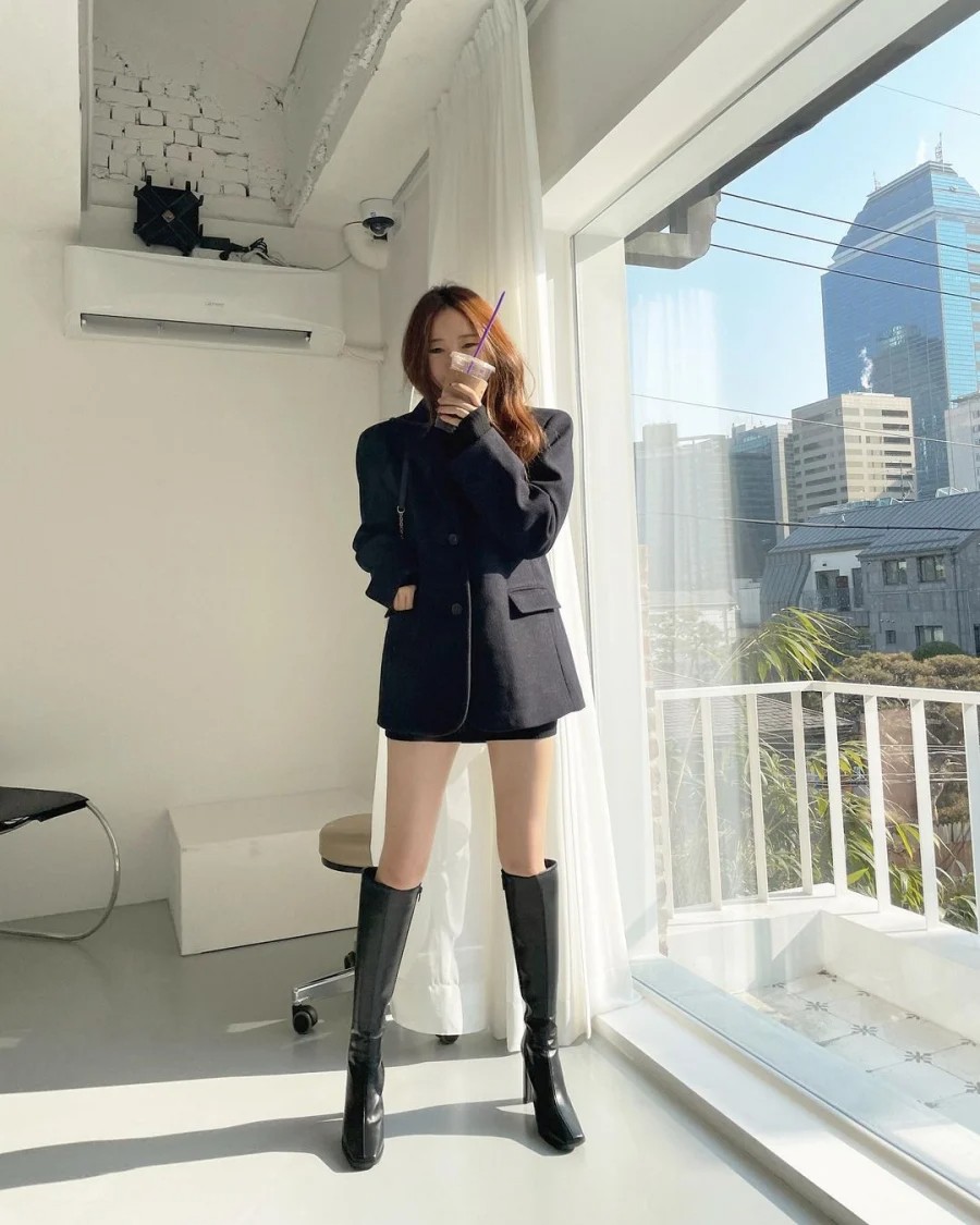 5. Nếu bạn định mặc váy ngắn, hãy mặc quần tất và đi boot đen