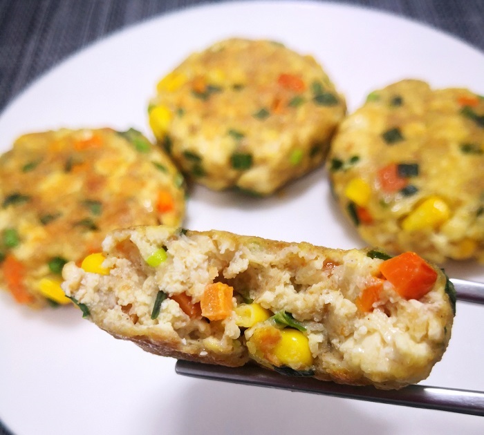 Bước 5: Nặn thành những miếng tròn, ấn dẹt và cho vào chảo chiên. Khi chiên nhớ lật thường xuyên đến khi miếng chả đậu chín vàng đều 2 mặt.