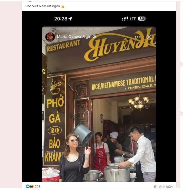 Mới đây, dân tình bất ngờ đăng tải bức ảnh nữ diễn viên phim "người lớn" của Nhật - Maria Ozawa xuất hiện tại Hà Nội khi trang cá nhân của cô chia sẻ khoảnh khắc check-in trước 1 quán phở.