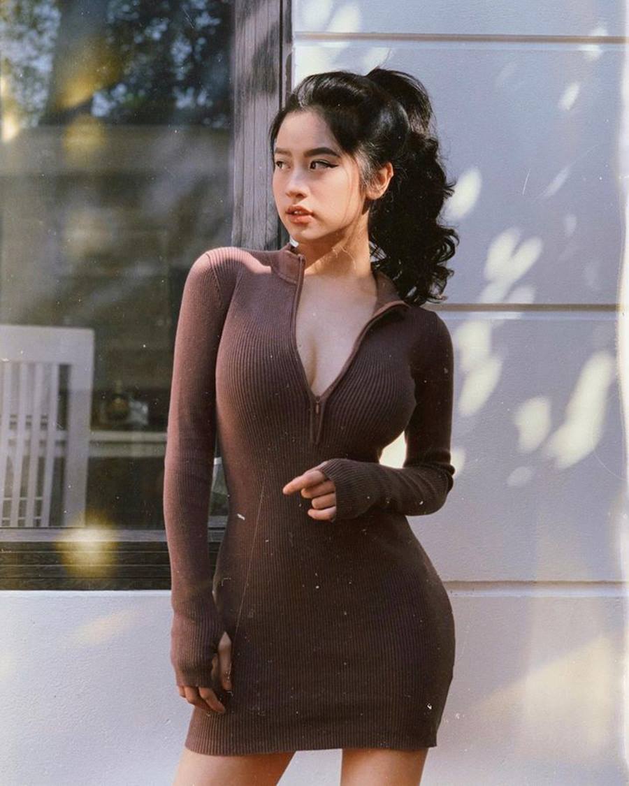 Hàn Hằng mặc váy thun len tăm khoe đường cong hình thể nóng bỏng. Kiểu váy có phom dáng kín đáo nhưng lại mang tới sự gợi cảm không hề nhỏ cho người mặc.