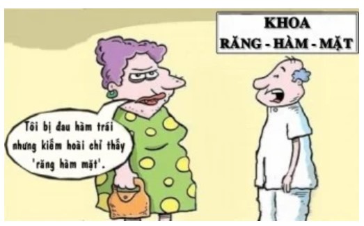 - Tôi bị đau răng bên hàm trái mà nãy giờ tôi đi kiếm hoài không thấy khoa nào đề bảng 'Răng hàm trái' hết mà chỉ có khoa 'Răng hàm mặt ' nên tôi đâu dám vô.