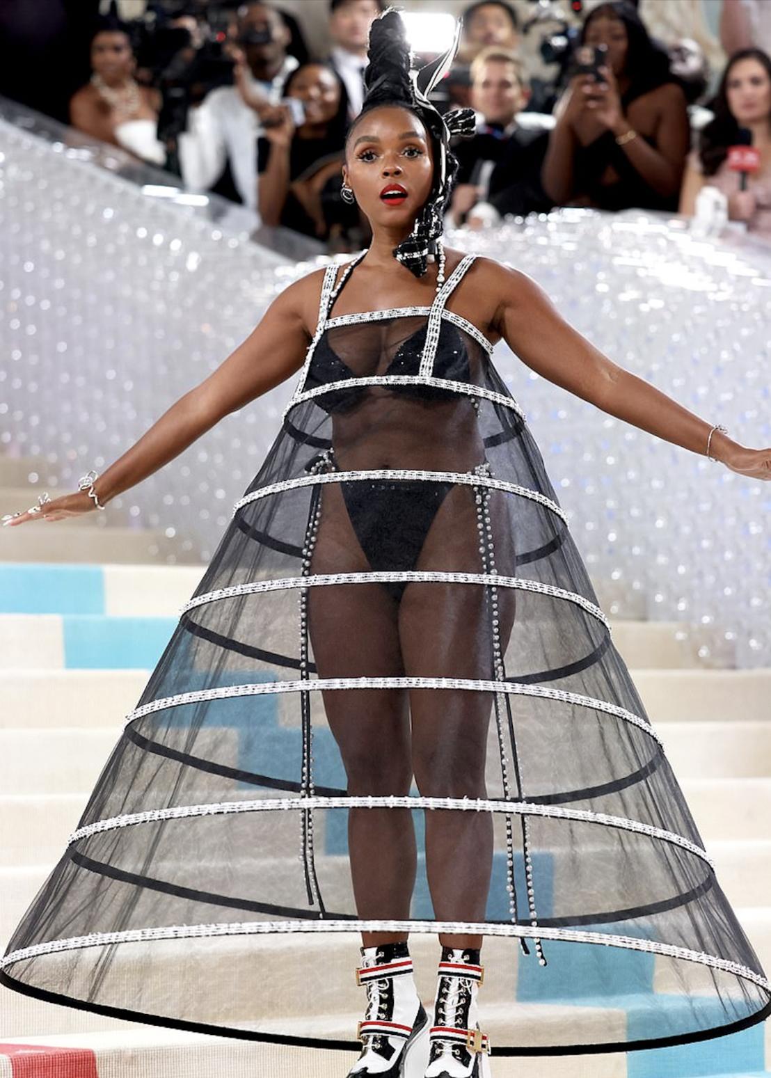 Tại Met Gala 2023, Janelle Monáe cũng gây sốt khi khoe 90% da thịt trong bộ bikini sequin và chiếc tùng váy trong suốt. Trước đó, ca sĩ cũng để ngực trần trong sản phẩm âm nhạc Lipstick Lover.