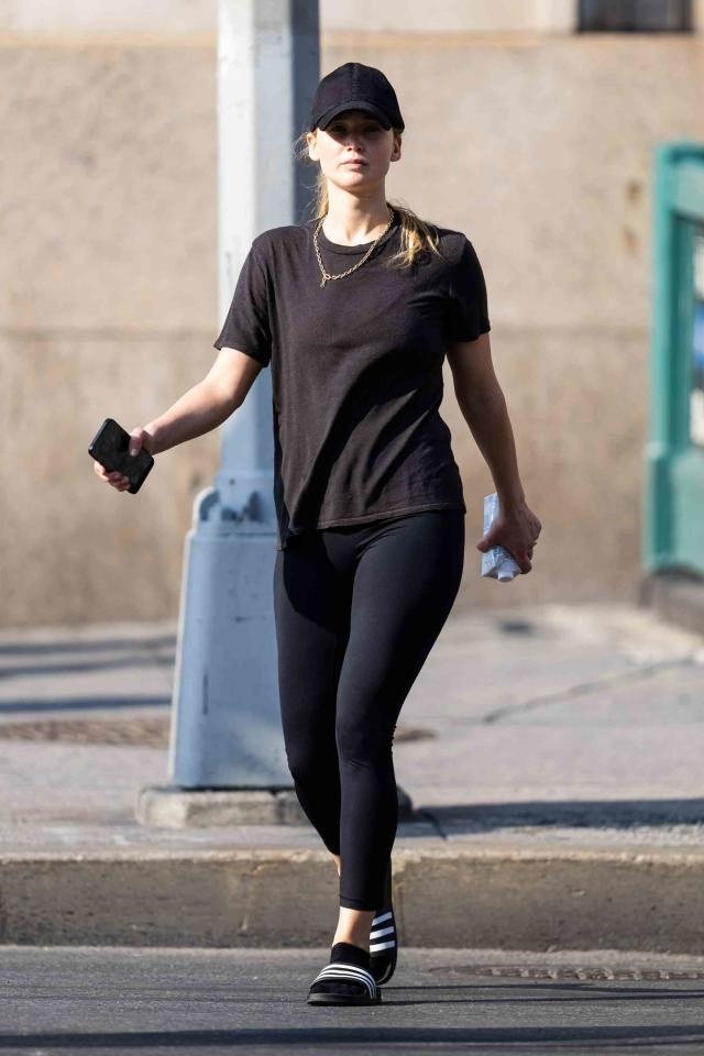 Ngay sau khi sự kiện điện ảnh danh giá này kết thúc, Lawrence lại bị bắt gặp khi xuất hiện trên phố với đôi dép kẻ sọc nổi tiếng của nhãn hàng thời trang thể thao adidas. Với món đồ này, cô sử dụng thêm vớ thấp cổ để giữ ấm.