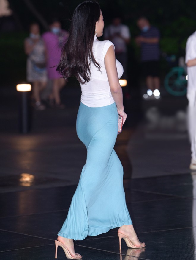 Các trang mạng đã chia sẻ nhiều hình ảnh một cô gái nổi bật giữa đám đông khi dạo bước trên phố. Trong hình, người đẹp này diện áo thun cao cổ cùng chân váy dáng dài. Kết hợp với đó, cô chọn một đôi giày cao gót màu nude tạo cảm giác chân dài và tỉ lệ cơ thể đẹp hơn. Thiết kế trang phục có màu trắng, xanh làm tổng thể thêm phần bắt mắt, thu hút.