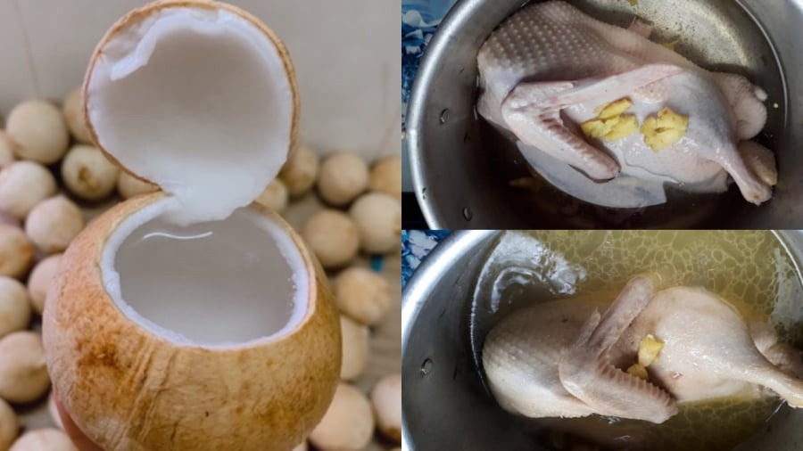 Một bí kíp để thịt vịt thơm ngon, béo ngậy chính là sử dụng một phần nước dừa non để luộc vịt (lưu ý, không dùng dừa già). Bạn có thể lấy nước của 1-2 quả dừa non đổ vào nồi, chế thêm nước để đủ ngập con vịt.