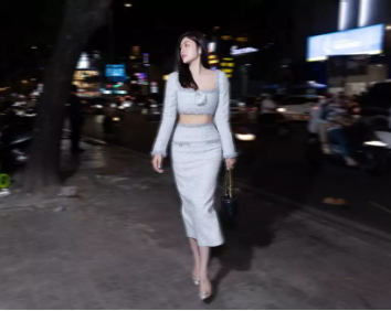 Nhưng phong cách phổ biến nhất chắc có lẽ là những chiếc đầm ôm, nâng ngực phối áo khoác hoặc có tay che vai. Vì khuyết điểm của cô là có một bờ vai không được mong manh cho lắm nên cô sẽ chọn những chiếc đầm ôm có thể phô được ưu thế vòng 1 và vòng 2.