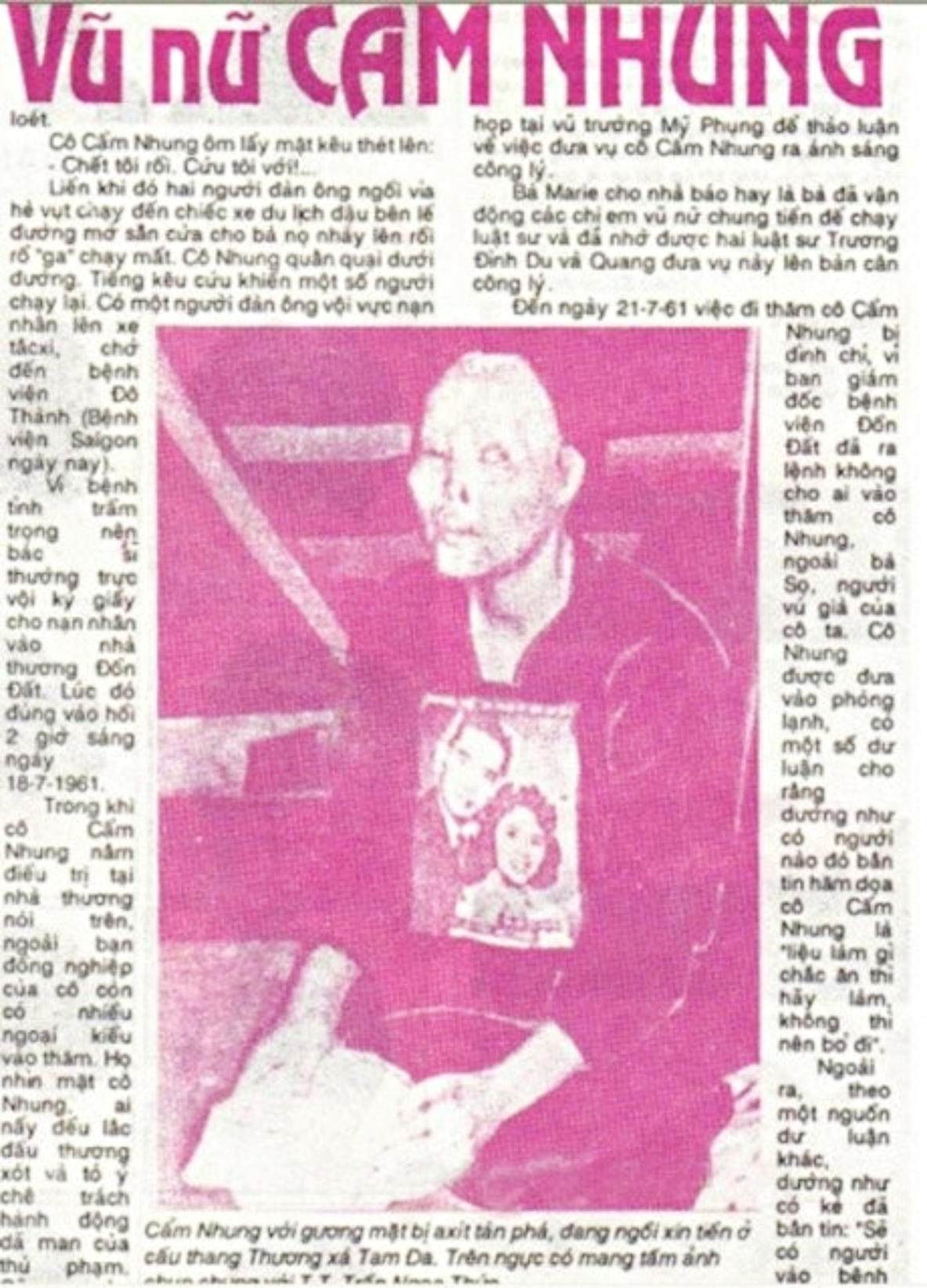 Bỏ ra 2 lượng vàng, bà Nguyệt thuê 2 tay giang hồ đón đường, tạt ca axít đậm đặc vào mặt cô vũ nữ xinh đẹp, tạo nên vụ đánh ghen chấn động Sài Gòn một thời. Vụ việc không chỉ hủy hoại toàn bộ nhan sắc mỹ miều của mỹ nữ Cẩm Nhung, mà còn khiến bà mù lòa suốt đời.