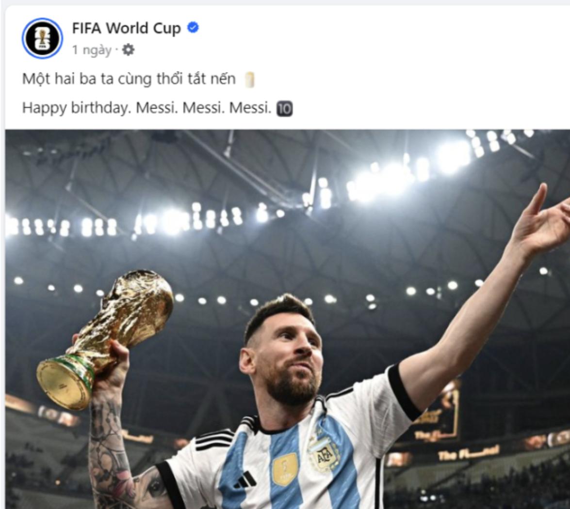 Trong ngày Messi tròn 37 tuổi, FIFA đã đăng đến 7 bài viết để tri ân Messi, trải dài ở nhiều khung giờ khác nhau. Với các khán giả Việt Nam, FIFA còn chu đáo chuẩn bị một bài đăng bằng tiếng Việt với dòng chú thích là lời bài hát của “Khúc hát mừng sinh nhật” nổi tiếng của ca sĩ Phan Đinh Tùng.