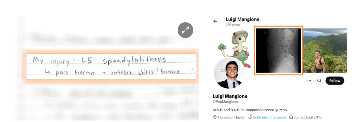 Trên mạng xã hội X, Mangione đăng một tấm ảnh chụp X-quang cột sống. Theo bác sĩ Hasit Mehta - giáo sư tại Đại học Y khoa New York, tấm phim cho thấy đây là ca phẫu thuật cố định cột sống, một thủ thuật sử dụng vít và thanh để cố định hai lớp cột sống nhằm giải quyết tình trạng lệch trục gây đau đớn dữ dội.