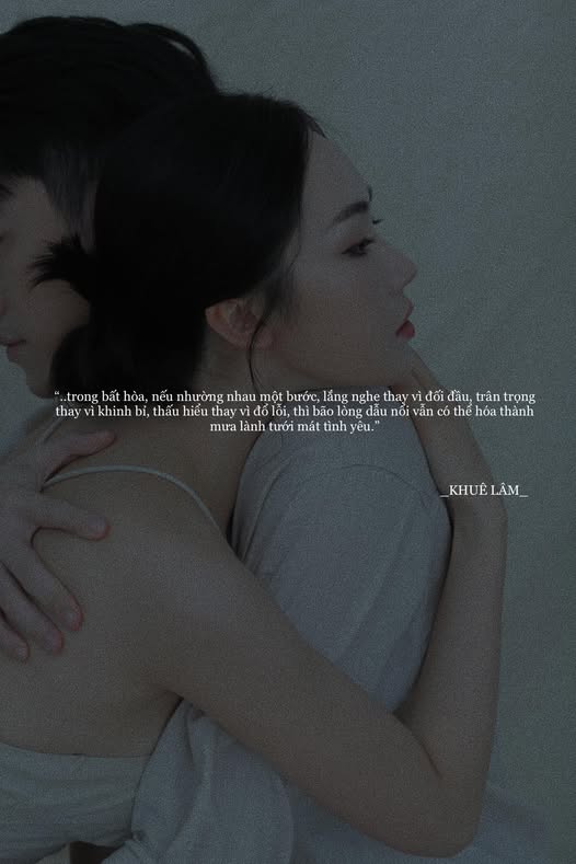 Anh tắt vòi nước, lau tay, quay lại, không trách móc, không châm chích. Anh lại gần, rót cho Cô ly nước mát, rồi nói: “Anh nghe em, em kể thêm đi?” Cô ngồi xuống ghế, bật khóc. Anh đưa tay lên vai Cô, không đẩy Cô ra, không cho rằng Cô quá đáng. Nước mắt Cô rơi, trôi đi cơn giận dữ ban đầu. Giờ chỉ còn lại hai người, cùng đối diện nỗi lo, nỗi sợ, chứ không phải kẻ thù.