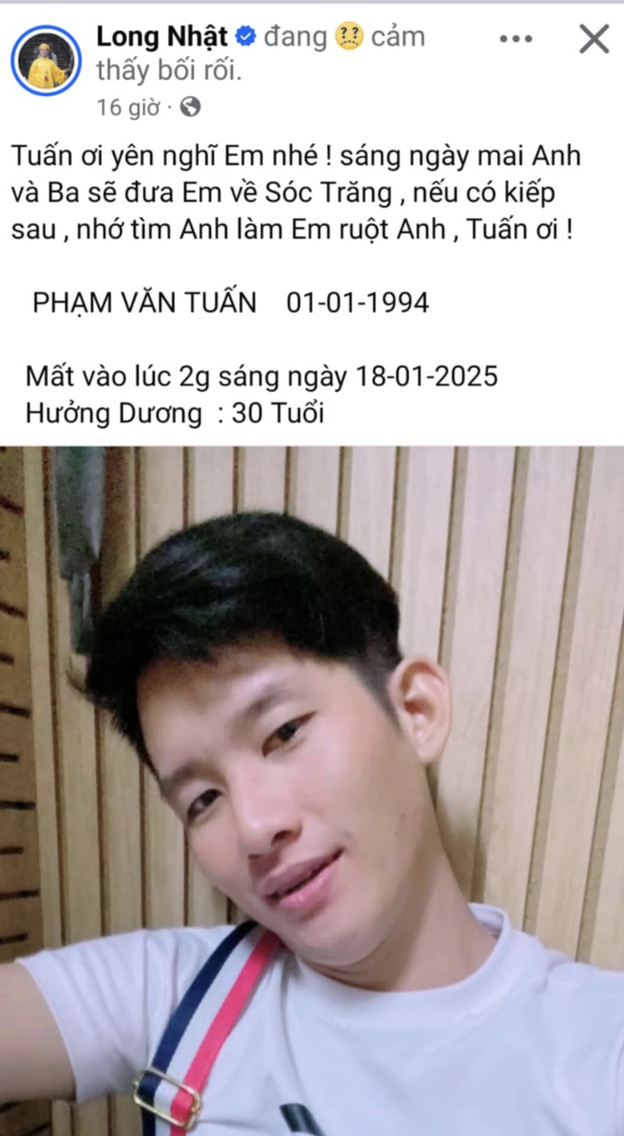 Được biết, người mất là trợ lý riêng của Long Nhật, tên Phạm Văn Tuấn, sinh ngày 1/1/1994. Theo nam ca sĩ gốc Huế, Phạm Văn Tuấn mất vào lúc 2 giờ sáng ngày 18/1/2025, hưởng dương 31 tuổi.