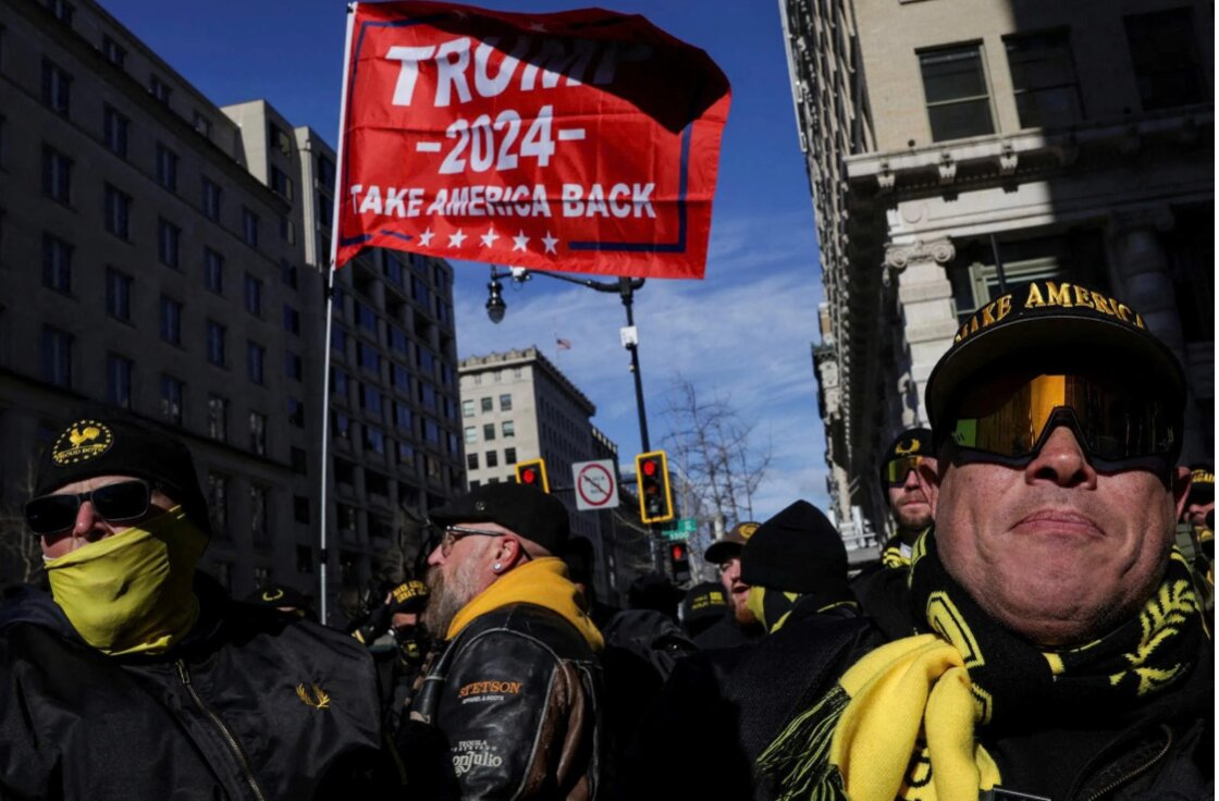 Nhóm phong trào cực hữu Proud Boys ngày 20/1 đã diễu hành trên thủ đô Washington với biểu ngữ chúc mừng sự trở lại Nhà Trắng của ông Trump, đồng thời kêu gọi tổng thống "thả tự do cho các thành viên của chúng tôi".