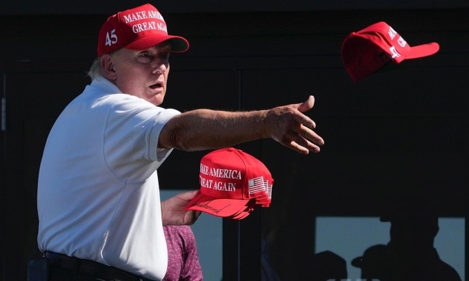 Ông Donald Trump ném những chiếc mũ có in thông điệp "Làm nước Mỹ vĩ đại trở lại" cho đám đông tại một giải golf ở Bedminster, New Jersey, hồi tháng 8/2023. Ảnh: AP