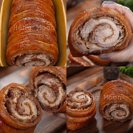- Cuộn miếng thịt lại (phần bì ở bên ngoài), quấn thật chặt quanh miếng thịt. Dùng sợi chỉ buộc lại và đ.âm những lỗ nhỏ trên bề mặt thịt.