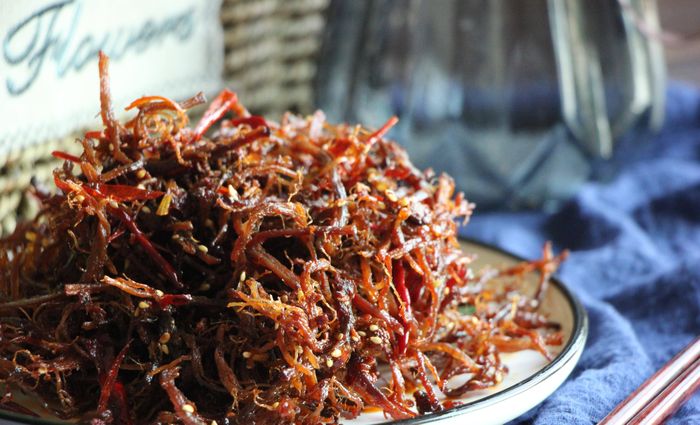Đổ dầu vào chảo, đun nóng tới nhiệt độ vừa phải, cho thịt bò sợi vào chiên. Khi mới bắt đầu, do thịt bò còn nước nên sẽ rất mềm, chiên một lúc thịt sẽ dần khô và màu sắc ngày càng đậm, khi thịt bò trở nên giòn và khô là được. Dùng vợt vớt thịt ra, để ráo dầu, cho vào đĩa.