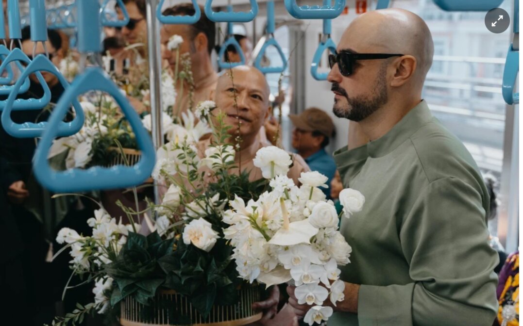 Ngày 12/4, hành khách trên tuyến metro Bến Thành - Suối Tiên bất ngờ chứng kiến một đoàn rước dâu đặc biệt: chú rể người Tây Ban Nha cầm bó hoa trắng, bạn bè và người thân bưng mâm quả cùng nhau bước lên tàu.