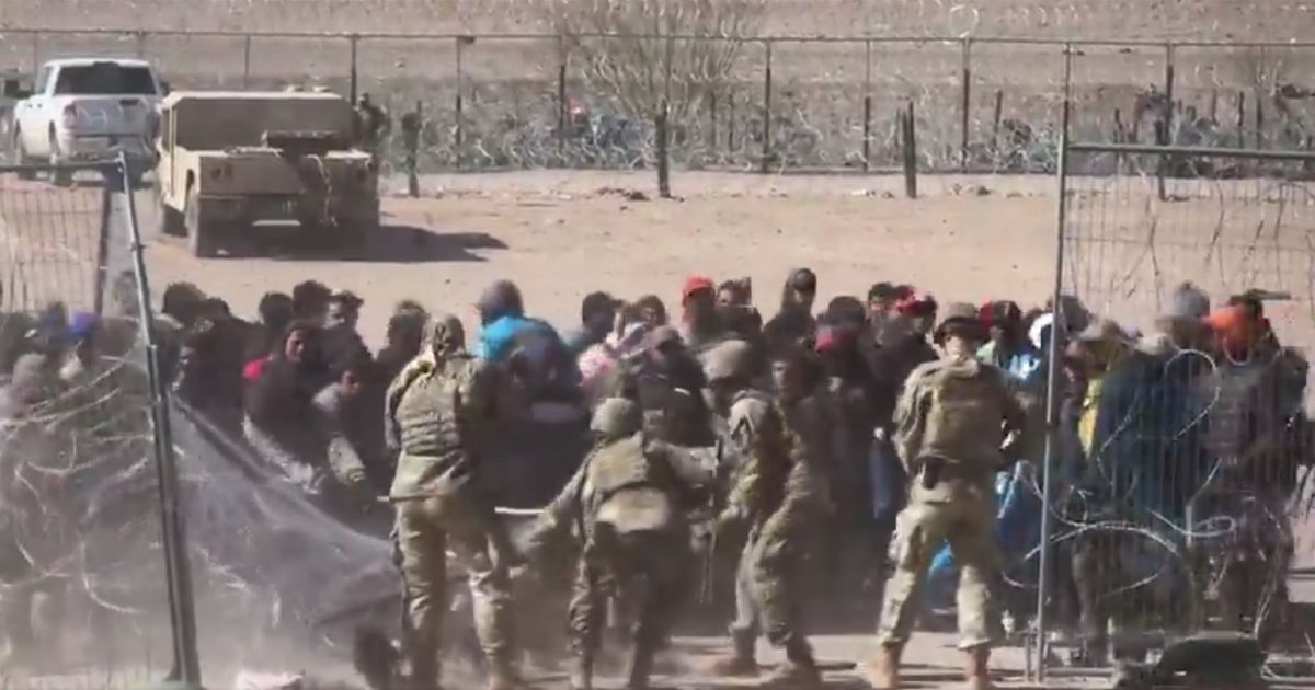 Ảnh chụp màn hình video này cho thấy khoảnh khắc các thành viên của Lực lượng Vệ binh Quốc gia Texas bị những người di cư nổi loạn tràn ngập để vượt biên giới ở El Paso vào ngày 21 tháng 3 năm 2024. (Ảnh chụp màn hình video Jennie Taer / X