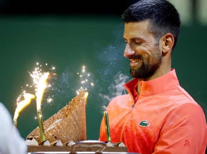 Djokovic nhận bánh chúc mừng sinh nhật 38 tuổi, sau trận thắng Matteo Arnaldi ở tứ kết Geneva Mở rộng 2025. Ảnh: Reuters