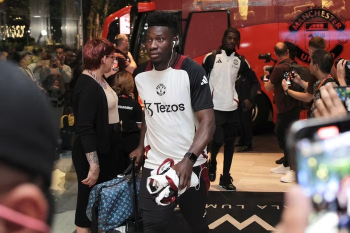 Khoảnh khắc Onana bước qua vòng vây máy ảnh của fan và truyền thông. Không khí náo nhiệt bao trùm khu vực sảnh chờ khách sạn.