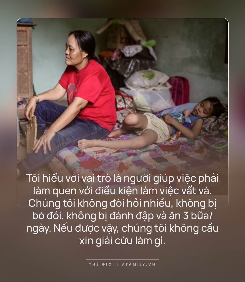 "Tôi hiểu với vai trò là người giúp việc phải làm quen với điều kiện làm việc vất vả. Chúng tôi không đòi hỏi nhiều, không bị bỏ đói, không bị đánh đập và ăn 3 bữa/ngày. Nếu được vậy, chúng tôi không cầu xin giải cứu làm gì", chị D. chia sẻ.
