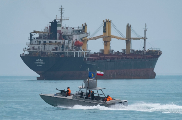 Cano của Lực lượng Vệ binh Cách mạng Hồi giáo Iran (IRGC) di chuyển dọc theo Vịnh Ba Tư gần một tàu chở hàng tổng hợp, ngày 29/4/2024. Ảnh: Reuters