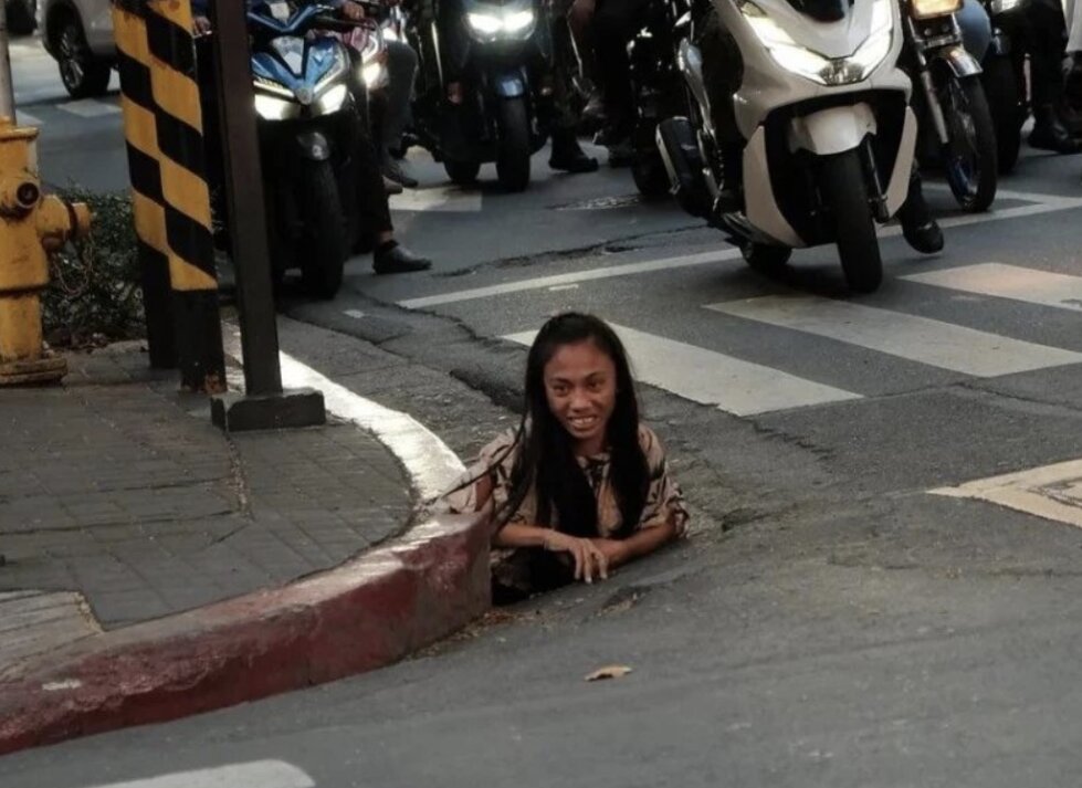 Một người phụ nữ ló đầu ra từ miệng cống thoát nước ngay khu vực giao giữa đường Adelantado giao với VA Rufino. Đây là khu vực đông đúc nhất thành phố.