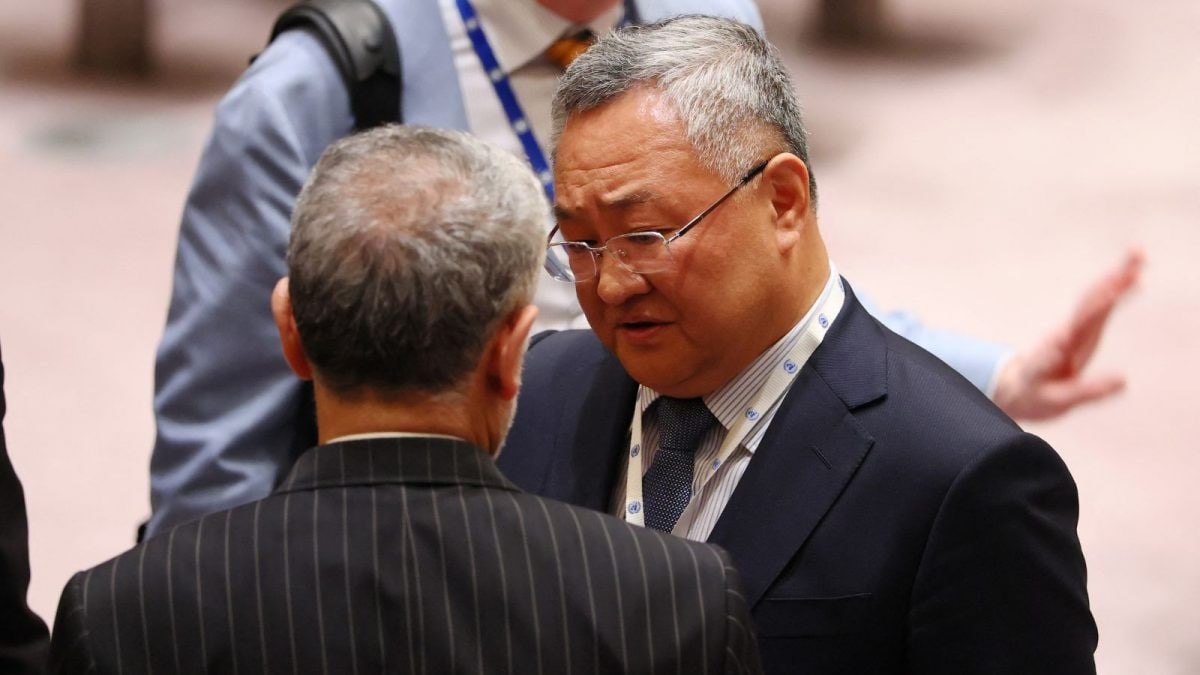 Đại sứ Amir Saeid Iravani, Đại diện thường trực của Iran tại Liên hiệp quốc, và Phó Thông, đại diện thường trực của TQ, gặp nhau trước cuộc họp của Hội đồng Bảo an Liên hiệp quốc. (Ảnh: Michael M Santiago/Getty/AFP)