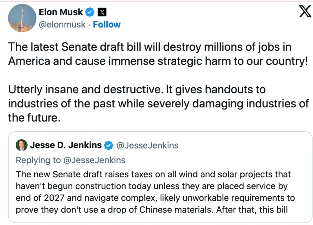 Trên nền tảng X hôm 28/6, tỷ phú Elon Musk Musk viết: “Dự thảo mới nhất của Thượng viện sẽ hủy diệt hàng triệu việc làm tại Mỹ và gây tổn thất chiến lược nghiêm trọng cho đất nước. Hoàn toàn điên rồ và hủy hoại. Dự luật này rót tiền cho những ngành công nghiệp của quá khứ, trong khi bóp nghẹt các ngành của tương lai”.