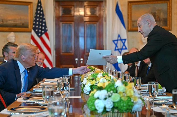 Thủ tướng Israel Benjamin Netanyahu (phải) trao thư cho Tổng thống Mỹ Donald Trump tại Nhà Trắng ngày 7/7. Ảnh: AFP