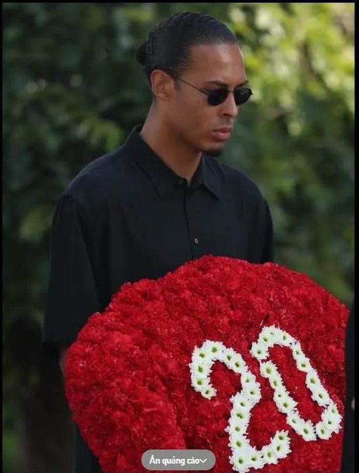 Đội trưởng Virgil Van Dijk ôm vòng hoa tưởng niệm tiền đạo Diogo Jota trong lễ chôn cất người đồng đội xấu số. Ảnh: AFC/Filipe Amorim.