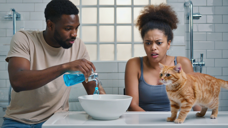 Anh hí hửng mang tô sữa đặt xuống, con mèo chạy tới ngửi… rồi chạy biến mất. Cô vợ ngạc nhiên: