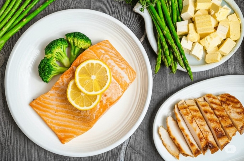 Cá hồi, thịt gà, đậu hũ, giàu protein. Ảnh được tạo bởi AI